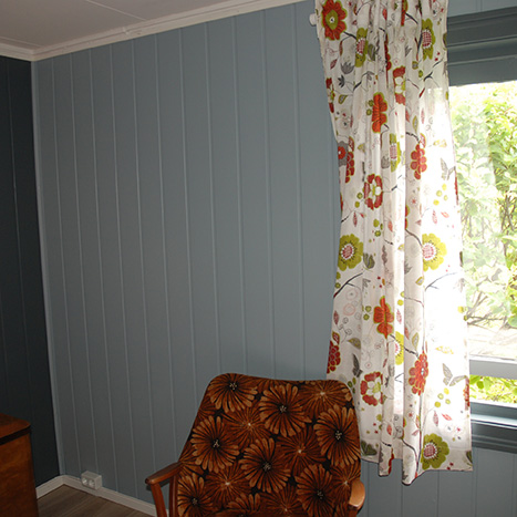 Jeg liker sommerhuset mitt så godt. Tror det må være en av de beste plassene på jorden. Nå er også soverommet “ferdig”. Ja, det er jo ikke helt ferdig da, men vi har malt og lagt gulv og ikke minst fått opp senga, nattbordene og kommoden. Jeg tror vi har fått til “50-tall stilen” som vi gikk for. Fargene er litt både litt reto- og litt sommerhusaktig, de gamle soveromsmøblene synes jeg forsterker innrykket av den tiden da svigerfar bygget huset – altså på tidlig 50-tall. Uansett, jeg synes at det ble skikkelig fint!