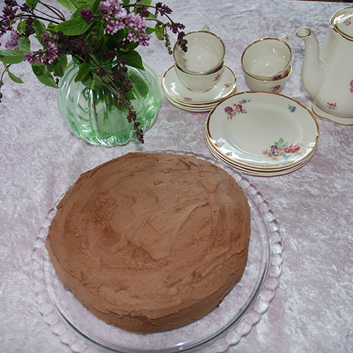 Siden datteren hadde med seg vennegjengen til sommerhuset vårt i pinsen nyttet jeg sjansen til å bake en kake som jeg lenge hadde hatt lyst til å bake: Mørk sjokoladekake etter oppskrift Baker Brun (2018), “Våre beste oppskrifter. 125 år med tradisjonsbakst“, side 87. Tenkte at siden jeg hadde fylt fryseren med grovere horn, lubne horn og franske boller , passet det vel godt å toppe det med en saftig sjokoladekake. På bildet i kokeboka er kaka skikkelig lekker og jeg gledet meg både til å bake kaka og til at jentene skulle få smake den. Ja da, jeg bakte kaken torsdag i forrige uke, så jeg vet at jeg publiserer innlegget litt vel sent. Men sånn må det bare bli denne gangen – Jeg glemte nemlig å ta ut bildene fra fotoapparatet før jeg dro, og jentene ankom sommerhuset. Men nå er jeg tilbake, med full tilgang på bildene.