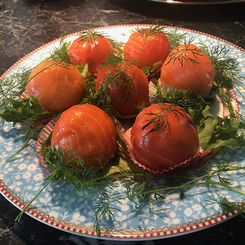 | 4 Monter laksekulene: – Legg plastfolie i glassene. – Fordel lakseskivene, slik at de dekker: bunnen og sidene på glasset – Fyll på med ost – Dytt inn biter av crabsticks – Legg en skive egg på toppen – Sett glassen i kjøleskapet i et par timer |