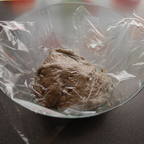 Bland fingervarmt vann, med mel. Dekk bollen med plast og la den stå i romtemperatur til neste dag