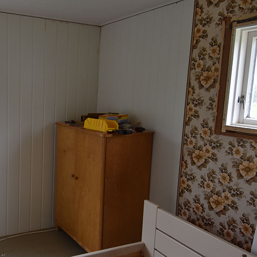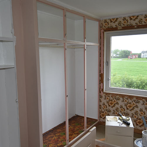 Det er skikkelig deilig med ferietid, og i år er det oppussing av sommerhus som står på ferieplanene. Så langt denne uka har vi – bestemt oss for farge på gjesterommet og malt ferdig taket og skapene. Ja ikke utvendig da – bare innvendig. Det er utrolig hvor mye friskere det ser ut, bare med noen (les: fire) strøk med hvit maling. Jeg begynte med tak maling inne i skapene, men det ble veldig matt, så jeg måtte male et strøk med halvblank hvitmaling som siste strøk, og det utgjorde stor forskjell. ja, det utgjorde faktisk så stor forskjell at jeg malte et ekstra strøk med hvit halvblank maling i skapet på soverommet vårt også. I tillegg, er vi nesten ferdig med å legge plater på veggene. Så, nå skal jeg gå i gang med å male dem. kanskje jeg rekker to strøk i dag . Malingen er overmalbar etter seks timer. Så vi får se hva vi rekker.