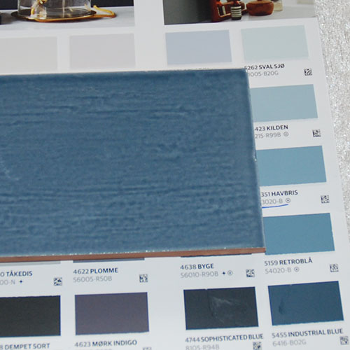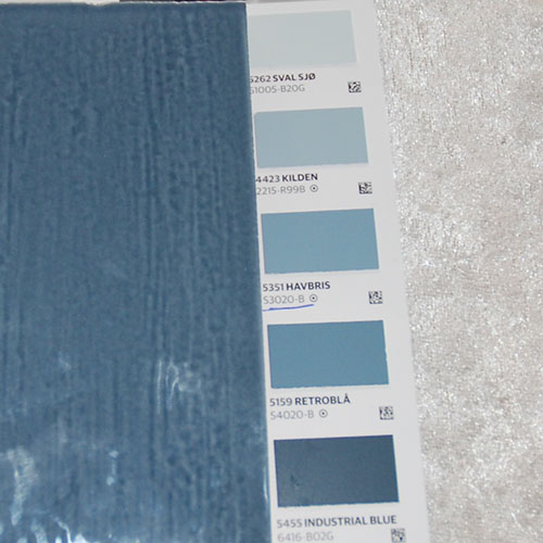 Men da vi kom til sommerhuset, og så fargene vi hadde valgt ut, så de både kjedelige og duse ut. Vi ombestemte oss derfor på flekken! Fargene ser kanskje ikke så verst ut på bildet ovenfor, men de så faktisk mye lysere og kjedeligere ut i sommerhuset, enn hva de gjør på bildet ovenfor. Derfor var vi en ny tur på flisbutikken i går, og valgte nye fliser. Resultatet ble, denne gangen, en litt mer spenstig blå. Derfor må vi nok skifte ut fargepaletten (malingen) også! Så nå har vi tatt med oss ei ny flis, som skal bli med til Sommerhuset i dag, og et fargekart. Så får vi se hvordan det blir når vi får studert dem i det lyset hvor de skal settes opp. Slik det ser ut akkurat nå, er jeg veldig fornøyd. Det var jeg jo, strengt tatt også med det forrige valget av fliser, helt til vi så det i lyset på kjøkkenet. Likevel håper jeg og tror at vi har valgt rett denne gangen. Hva synes du?