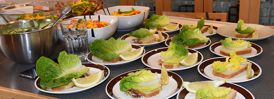Tro det, eller ei, men midt i all oppleggingen og serveringen av maten, glemte jeg rett og slett å ta bilde av den. Jeg hadde jo tenkt å vise frem 28 flotte forretter som alle var klar for servering. Vi skar opp brødet og la på salat før gjestene kom . Siste finish skulle vil gjøre når gjestene kom. Da skule bildene tas. Men den gang ei, slik gikk det ikke. For Ingrid la opp Skagensrøra, og jeg serverte. I alt dette stresset, glemte jeg rett og slett å ta bilde. Ikke et eneste bilde av forretten tok jeg. Nei, det er ikke helt rett – jeg tok bilde av tolv brødskiver med salatblad for å se hvordan det tok seg ut, når jeg skulle ta bilde etterpå.