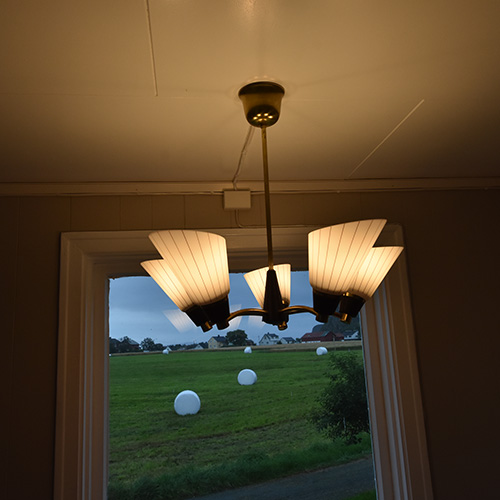 Siden vi fremdeles mangler noen hyller, kurver og en mikrobølgeovn, ble ikke alle skapene helt ferdige. Men nesten. MEN vi har fått hengt opp taklampa, som lenge har vært planlagt å henge i taket på kjøkkenet. Jeg synes lampa er skikkelig fin. Min farmor og farfar hadde denne hengende over spisestuebordet sitt. Derfor er jeg så glad for at den nå har kommet på plass i sitt nye hjem.