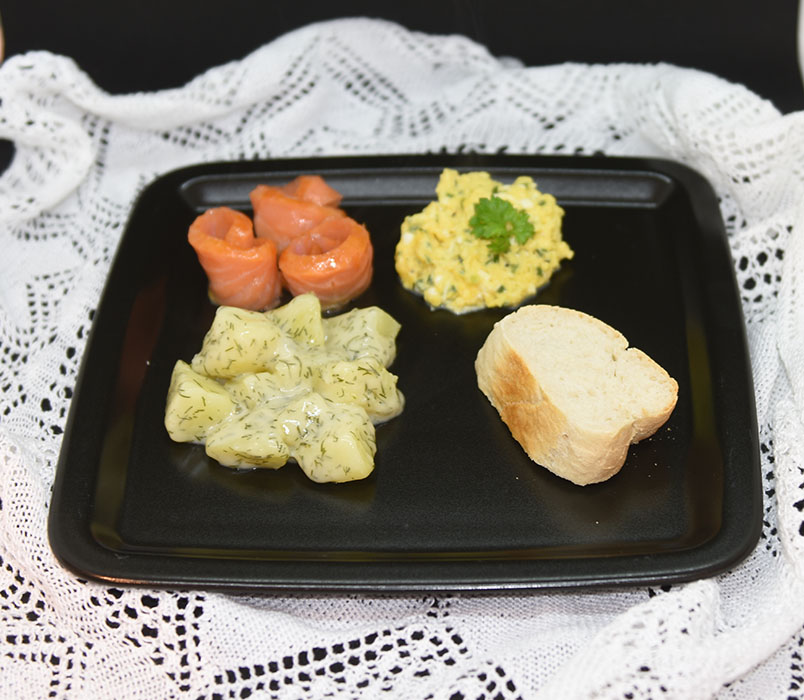 Røkt laks med Dillstuede poteter, Eggerøre og lys Baguette er en skikkelig god lunsjrett.