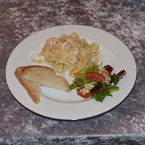 | 3 Ha reker og dill i sausen, og – La det stå på svak varme til pastaen er ferdig kokt, og Rekene er blitt lunkne/varme |
