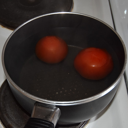 Tips! Jeg bruker å fryse tomater jeg ikke rekker å bruke. Til oppskrifter slik som denne tar jeg dem opp, skjærer et kryss i toppen av tomatene, og legger dem i kokende vann til skallet «slipper» og trekker skallet av. (Du kan selvfølgelig også gjøre dette med ferske tomater)