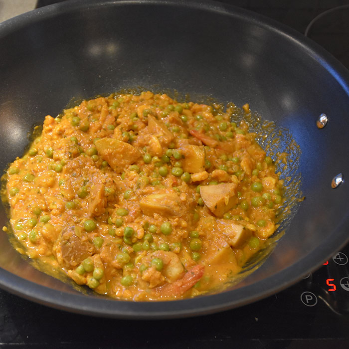 | 3 Tilsett karripulver, koriander, kumin, salt og kayennepper Mens du rører – La det surre under omrøring i 1-2 min. |