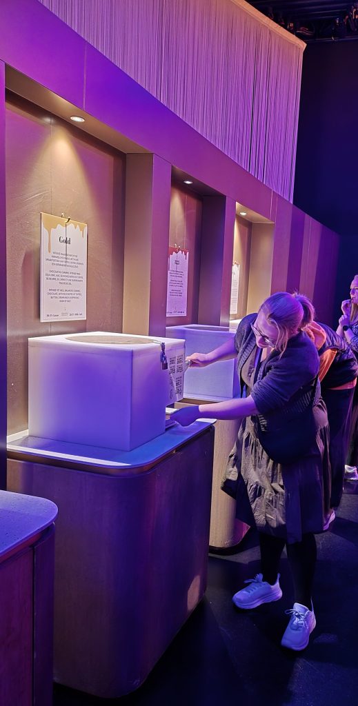 Og når man tenker at “nå har jeg vel sett alt” – bam! – så kommer smaksrommet. Det er kanskje det beste med museet. Du står foran en hel vegg med dispenserne fulle av flytende sjokolade og du får smake. Ikke bare én gang. Ikke to ganger. Jeg mistet tellinga etter sju. Det er et rom der du kan trykke på knapper og få varm sjokolade i skjeen fra forskjellige maskiner – mørk, lys, rød, gold, hvit, med hint av salighet og eventyr. Jeg følte meg som en voksen versjon av Charlie i sjokoladefabrikken, minus Oompa Loompaene (litt skuffa der, faktisk).