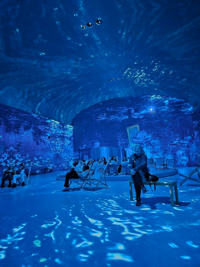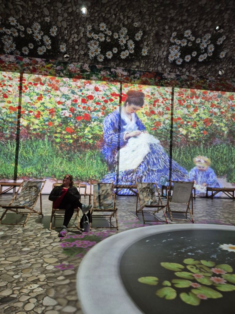 Allerede i inngangspartiet kjente jeg at skuldrene sank. Rommet var mørkt, men ikke dystert – mer som et stille pust : vegger og gulv badet i Monets ikoniske penselstrøk, projisert rundt meg, levende og pulserende i takt med musikken. Det var som å tre inn i et maleri, midt i en blomstrende hage, mens solstrålene danset mellom bladene. Jeg ble stående lenge før jeg endelig satte meg ned i en fluktstol.