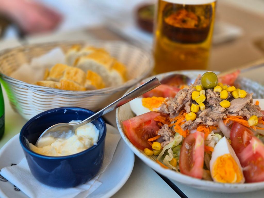 Måltidet startet med ferskt brød, aioli og en liten salat – helt perfekt mens man venter på forretten. Aiolien var kremete og smaksrik, akkurat sånn jeg liker den.