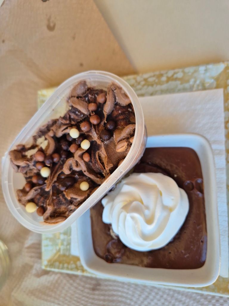 Og selvfølgelig ble det dessert: en myk og mørk sjokoladekake og is, akkurat passe søt, og servert med en kremtopp og en kopp kaffe som seg hør og bør. En flott avslutning som rundet det hele av på beste vis.