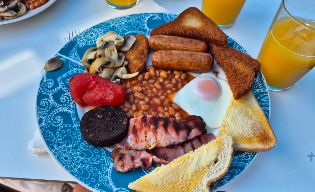 Vi hadde bestemt oss for å starte dagen på den engelske måten – med full frokost på Marina Bar. Et lite stykke England midt i Spania, komplett med stekte egg, bacon, pølser, bønner og toast. Mye mat? Absolutt. Veldig fett? Ja. Men også litt trøst og mye kos akkurat i dag.