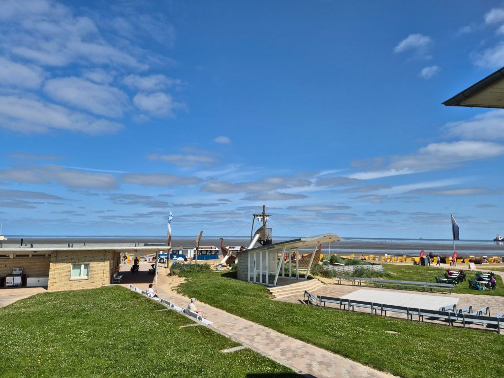 På begynnelsen promenaden, under en markise med pelargonier som blafret i brisen, fant vi en liten kafé. Du vet – en sånn med ujevne bord og vonde stoler, men med utsikt over stranden og hyggelig personale. Her bestilte vi kaffelatte og stikkelsbærkake. Søt og syrlig, med vaniljekrem og marengslokk. En ekte tysk klassiker, og så langt unna posekake man kan komme. Det smakte ferie.