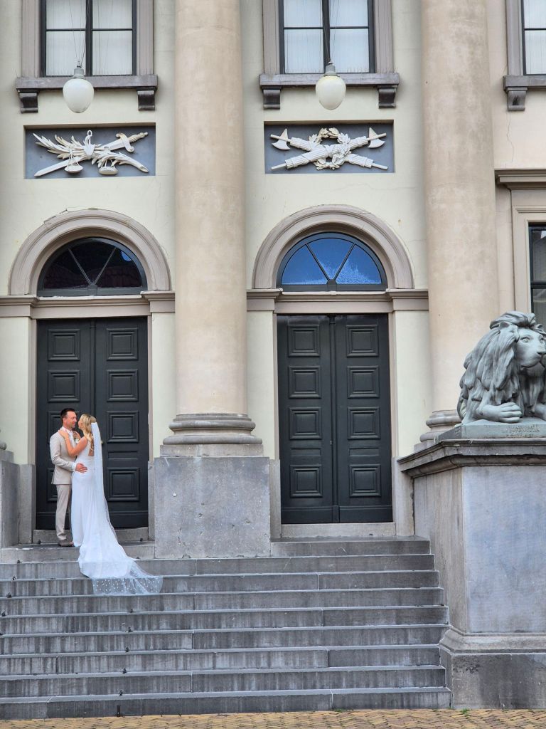 Og som kronen på dagen – rett foran rådhuset, på den brede steintrappa, var det bryllup! En liten gruppe hadde samlet seg, og midt i det hele stod et smilende brudepar. Ingen stress, ingen store fakter – bare ekte glede og noen risgryn i lufta. Vi ble stående i sykkelhjelm og solbriller og følge med på avstand – og kjente oss plutselig som statister i en nederlandsk film.