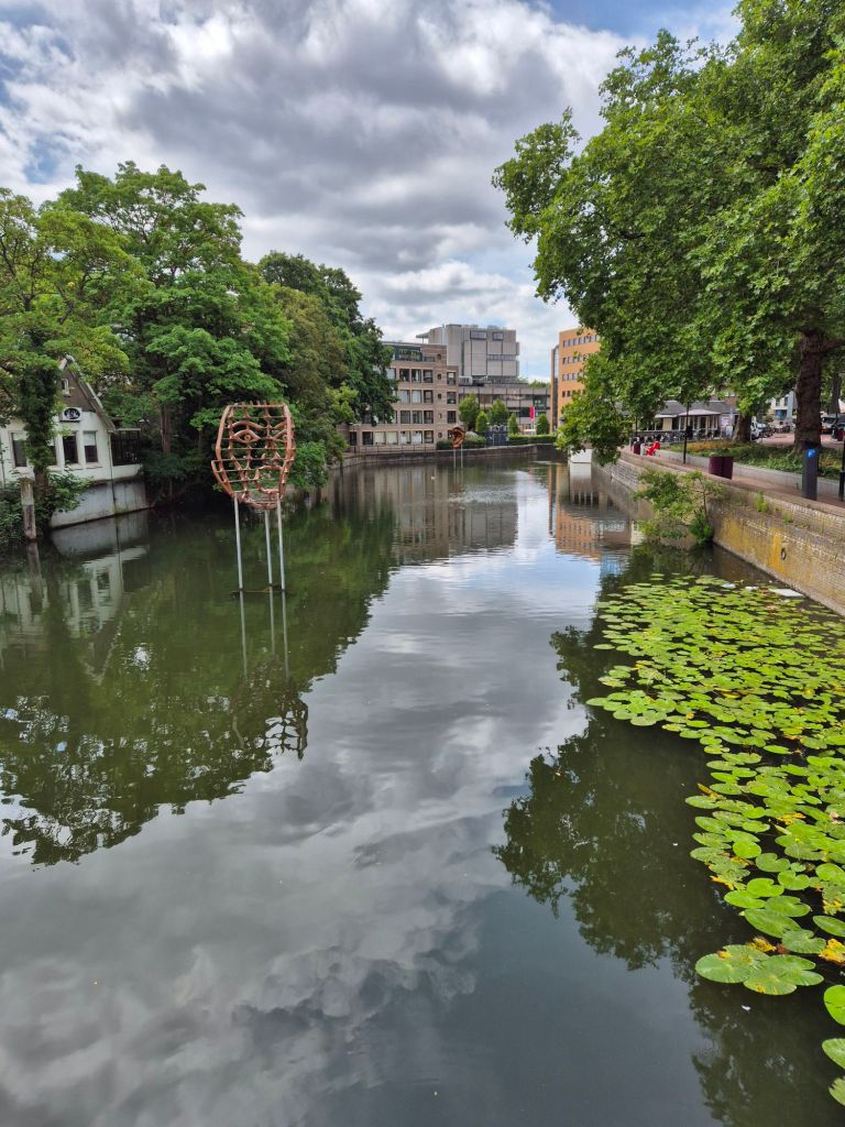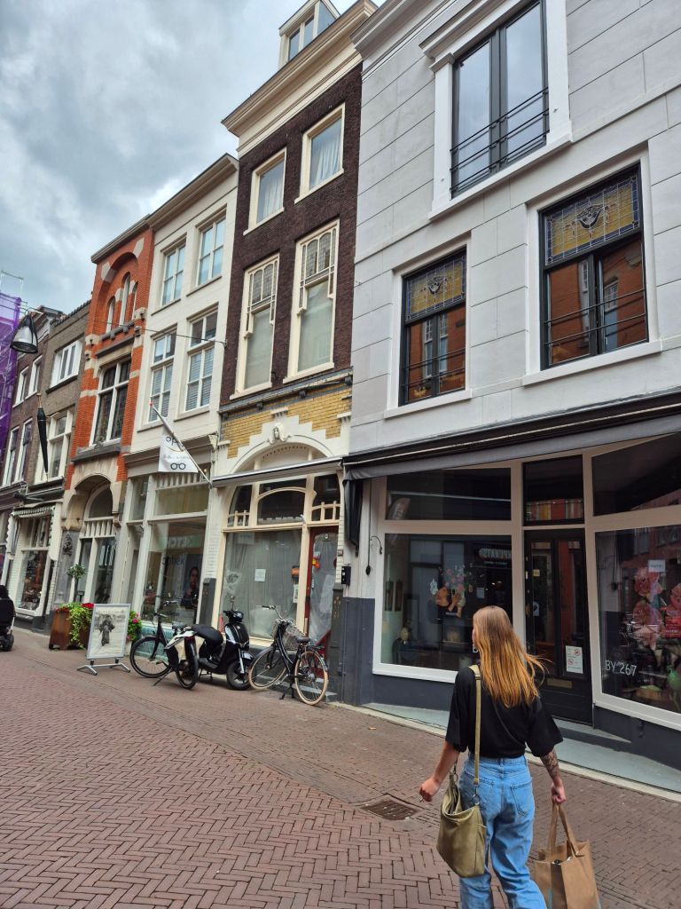 Det tok ikke lang tid før vi skjønte at Dordrecht ikke er en hvilken som helst liten by i Nederland. Her sitter historien i veggene – bokstavelig talt. Høye smale hus med snirklete detaljer, gamle skilt malt rett på murveggen, og kanaler som slynger seg gjennom sentrum. Hver gate føltes som en liten oppdagelsesferd.
