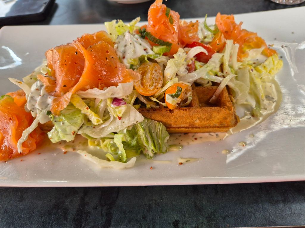 Det var… interessant. For å si det mildt. Faktisk forsvant vaffelen så totalt i alle de andre smakene at vi begynte å lure på om den i det hele tatt hadde vært der. Kunne like gjerne blitt servert som en salat – en slags hipster-variant med skjult karbo. Vi kalte den bare “Waffelen som ble borte i laksekaoset”.