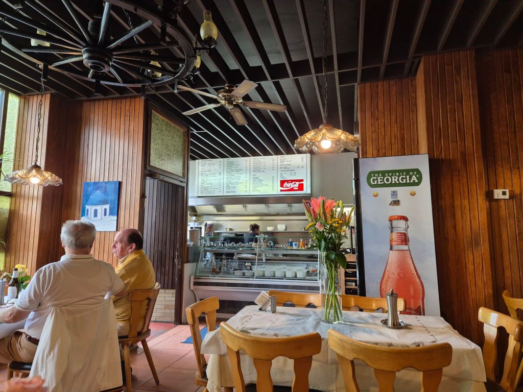 Vi bestemte oss for å være kulturelle – det vil si: drikke øl og spise det samme som alle andre: schnitzel. Og siden menyen også hvisket Ouzo, måtte vi jo ta en liten runde på det også. For stemningens skyld, selvfølgelig.