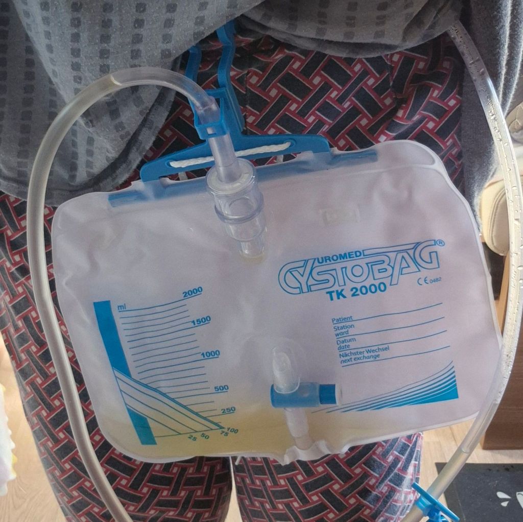 Jeg har nå fått en mindre pose som festes på leggen! Diskret, lettere å leve med – og den kan tømmes med en liten knepp hver fjerde time, i motsetning til den gamle som flagret rundt som en medisinsk forklefest.