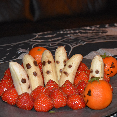 Bananene bør sprøytes med sitronsaft, så de ikke blir brune. Bananene er skrelt og det er brukt sjokoladebiter til øyne og munn. Mandarinene er bare tegnet på med tusj, så de ser ut som små gresskar. I tillegg er det lagt jordbær rundt omkring. Dekorativt, og et flott alternativ til sjokolade og drops.