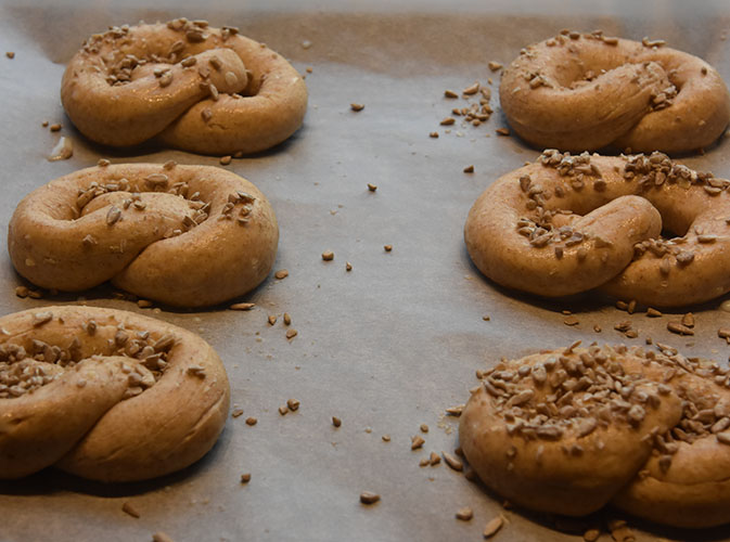 | 4 Hell deigen ut på et bakebord, og – Elt inn resten av melet, og – Del den i ca. 15 like store emner – Trill hver bit til en lang pølse – Form til kringler, og – Legg dem på stekeplata |